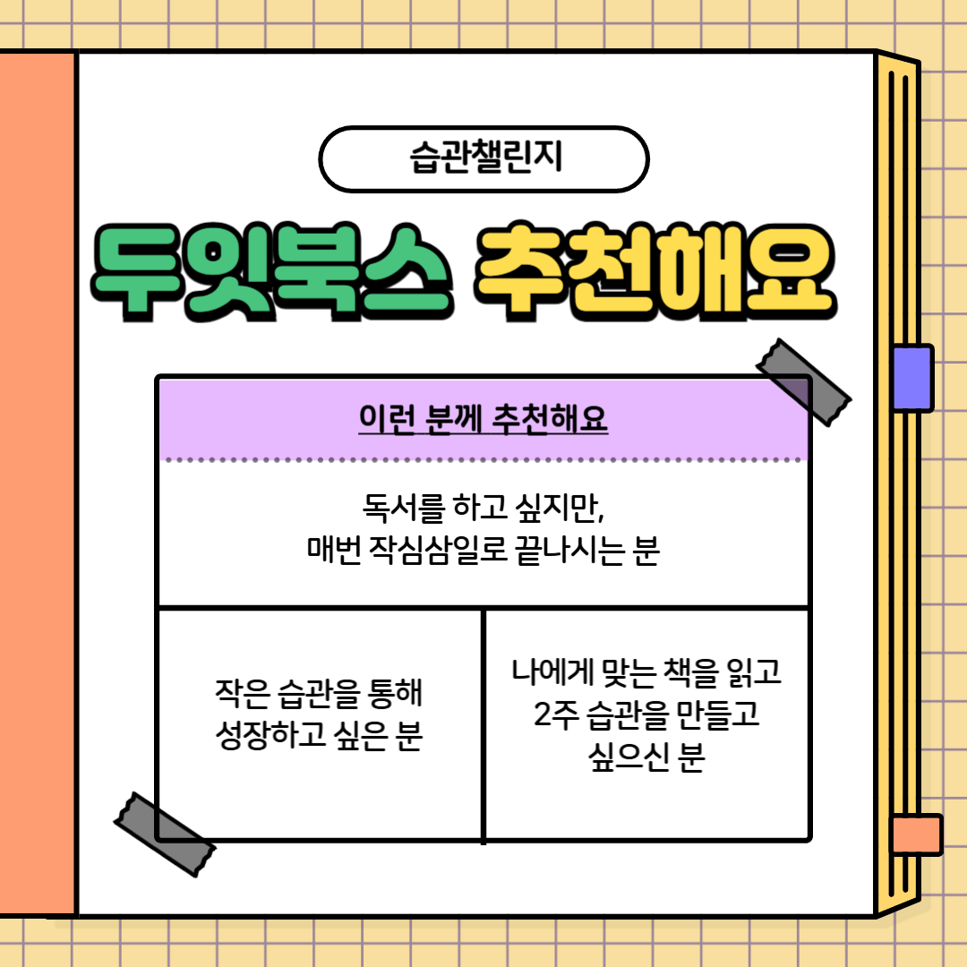 그래서 어떻게 하면 책을 꾸준히 읽을 수 있을까 하는 생각으로 ‘두잇북스 – 2주 독서 습관 챌린지’를 만들게 되었어요.