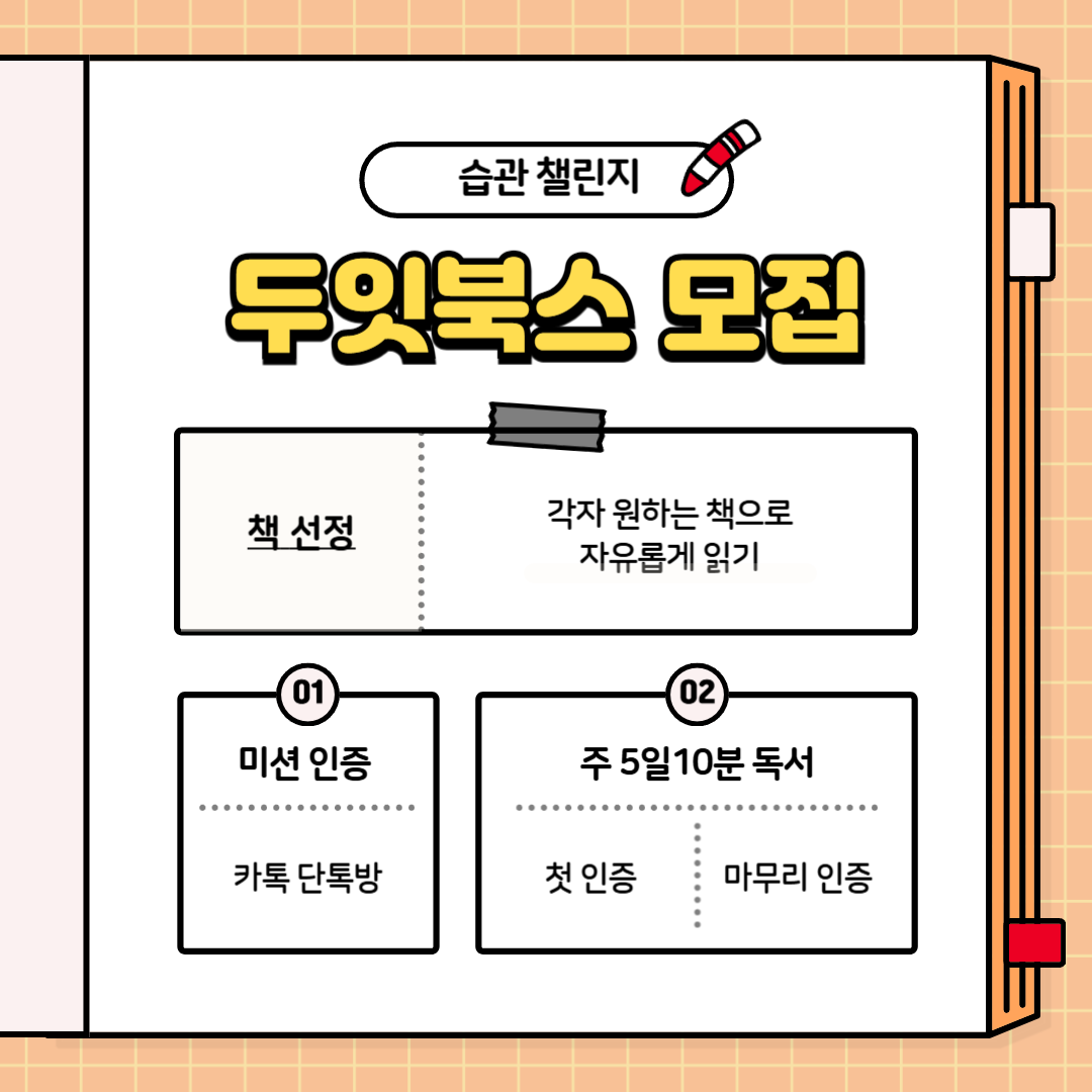 책은 늘 곁에 있지만, 펼치지 않으면 변화는 없습니다. 오늘 단 10분, 두잇북스 2주간의 도전이 습관을 통해 당신의 하루를 바꿔 보세요!